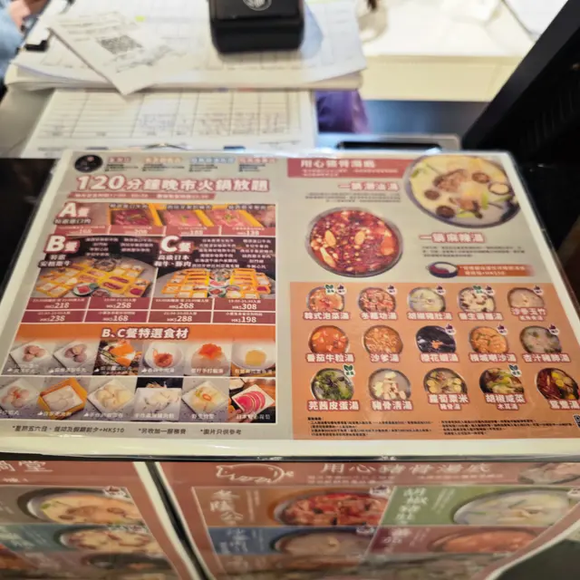 入場前先選定湯底及套餐;想食最優質食材所以選擇C餐,然後湯底必選是麻辣湯+潮汕湯!報上會員電話號碼,還有半殼鮮鮑加珍寶帶子贈送!