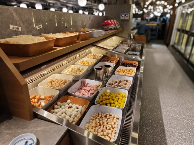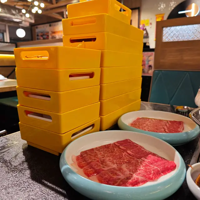 贈送的鮑魚及帶子先來個粉墨登場;其餘點選的食材上來時,堆疊起來的食物之牆別有一番風景;