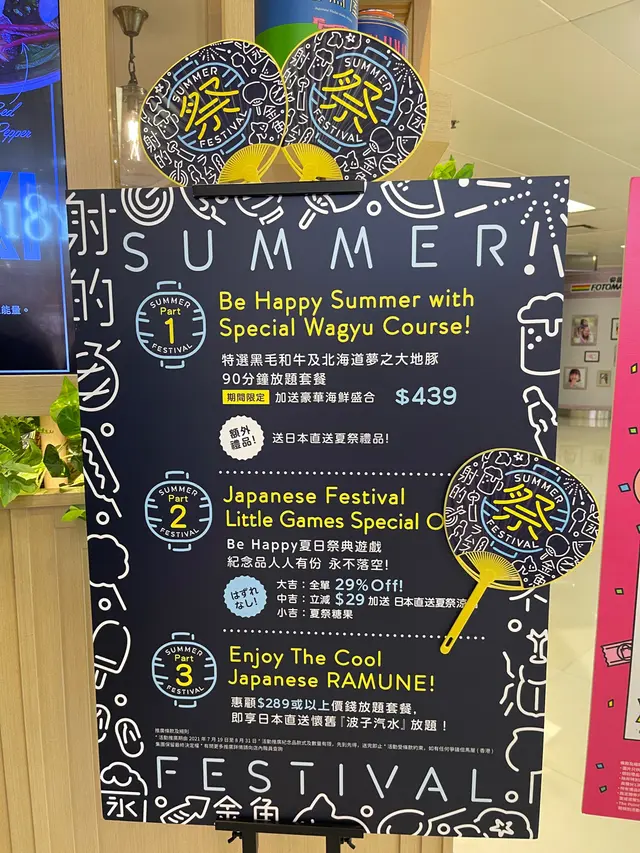 餐廳鋪面寬敞舒適而且五臟俱全❗而且餐廳滿佈期間限定日式夏祭裝飾,甚有日本風情❗而服務員的工作態度也十分友善,他們都非常之清楚了解餐廳提供的食物❗能夠向客人詳盡地介紹餐點❗餐廳的座位寬闊,客人都能在輕鬆舒快的環境下享受餐點❗炎炎夏日,餐廳近期推廣日式夏祭主題,當中更不乏日本傳統懷舊波子汽水及夏祭等色小食及小遊戲,讓食客彷彿置身於日本的盛夏祭典中享受美饌❗