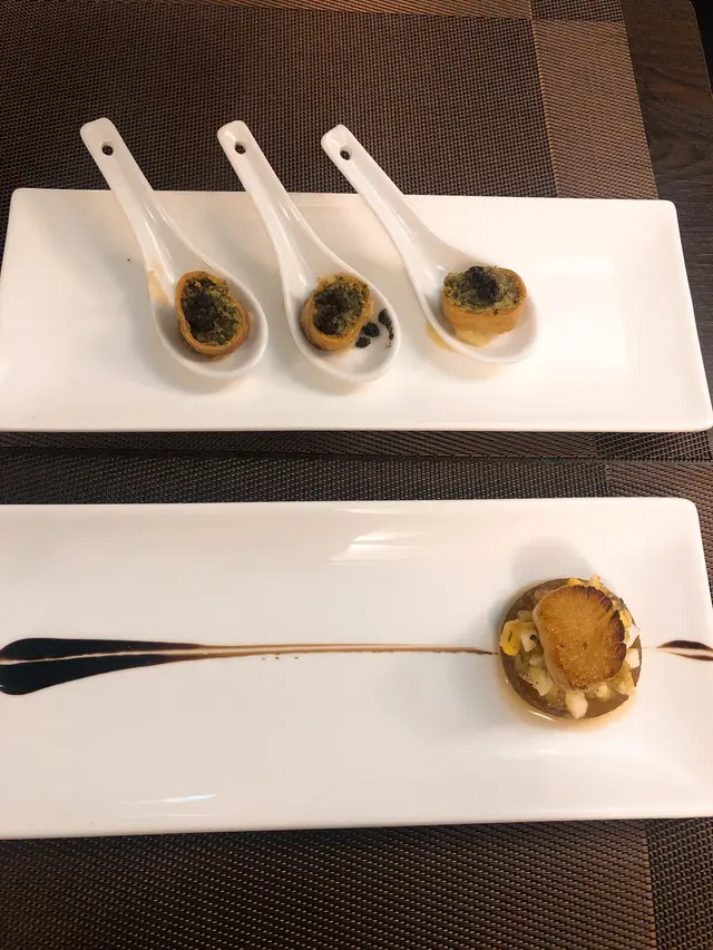我地揀既前菜係:法式焗田螺配黑松露及日式芥末茨䇯 and 煎北海道帶子配波蘭汁