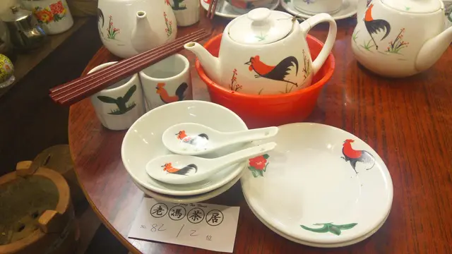 餐具中的杯碟、 匙羹和茶壺, 用上公雞系列。