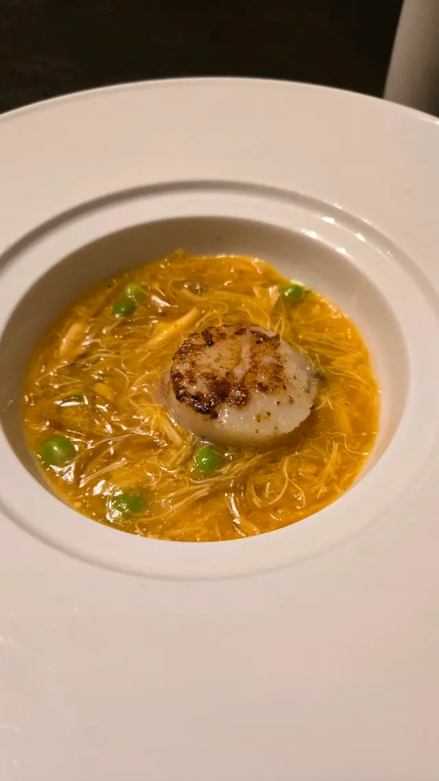 第三道「蟹黃銀針燴玉帶」係我全晚其中一道心水菜式。先講蟹黃汁,稠身得嚟好滑,味道鮮中帶甘,唔會搶走帶子味。銀針粉滑而分明,吸晒蟹黃精華,唔糊口。最重要係中間煎得啱啱好的帶子,表面微焦香脆,入面仲保持鮮嫩多汁,成道菜口感、味道、擺盤都近乎完美。
