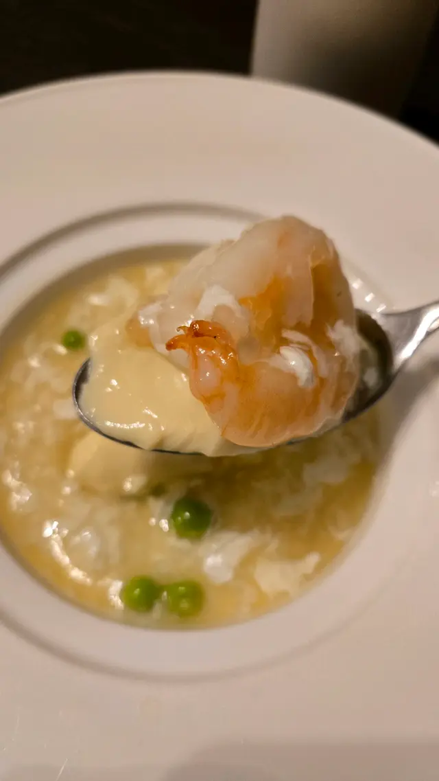 第四道「20年古月龍山花雕蛋蒸虎蝦球」係一道視覺與嗅覺同時滿足嘅菜式。花雕酒香滲入蒸蛋同蝦球,香而不嗆。蒸蛋滑得好似豆腐花,蝦球鮮甜結實,每一啖都食得出海鮮原味。
