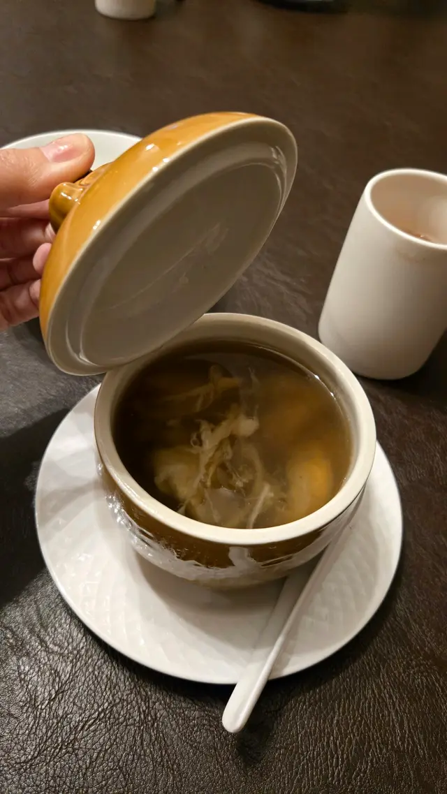 第二道係「大宅佛跳牆」,一打開蓋已經感受到誠意。湯底係非常清澈嘅一種,但香氣濃郁、膠質感重。材料包括花膠、海參、瑤柱、螺片等,一啖啖飲落去暖入心,完全冇落味精嘅燥。花膠炆得軟糯,螺片彈牙,係一碗可以飲清光嘅功夫湯。
