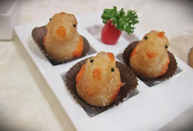 雞公仔($27)也太嬌俏了吧? 沒想到咸水角也可有如此多變的演繹, 花點心思, 利用皮搓出頭和身子, 擦上少許橙紅色素, 造成嘴巴和翅膀, 創意認真無限。
