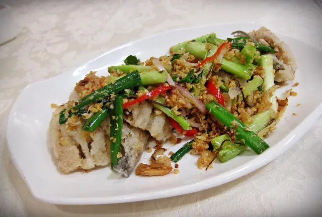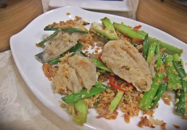 外層裹上薄薄的粉漿, 沾得緊密, 香酥卻沒漏至滿咀油, 有別於啖啖雪白幼嫩的魚肉, 脆感十足, 連中間的肉質和骨頭都脆卜卜, 不像是軟滑的質感, 吸收了葱蒜香氣, 算是另類的滋味。
