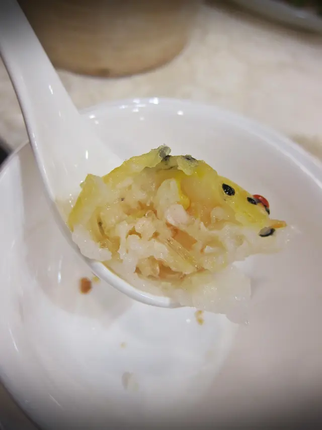 橘黃色的餃皮透薄均勻, 連收邊也不會太厚, 煙韌且有粗俗的韌度, 裡內的餡填得飽滿, 藏著素翅、蝦肉和貝類, 鮮甜盡出, 調味清淡卻不寡