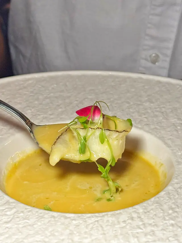 西班牙藍蟹加埋蝦同魚肉整成餡,配上有花椒油既蛋黃汁,呢個Fusion好有驚喜