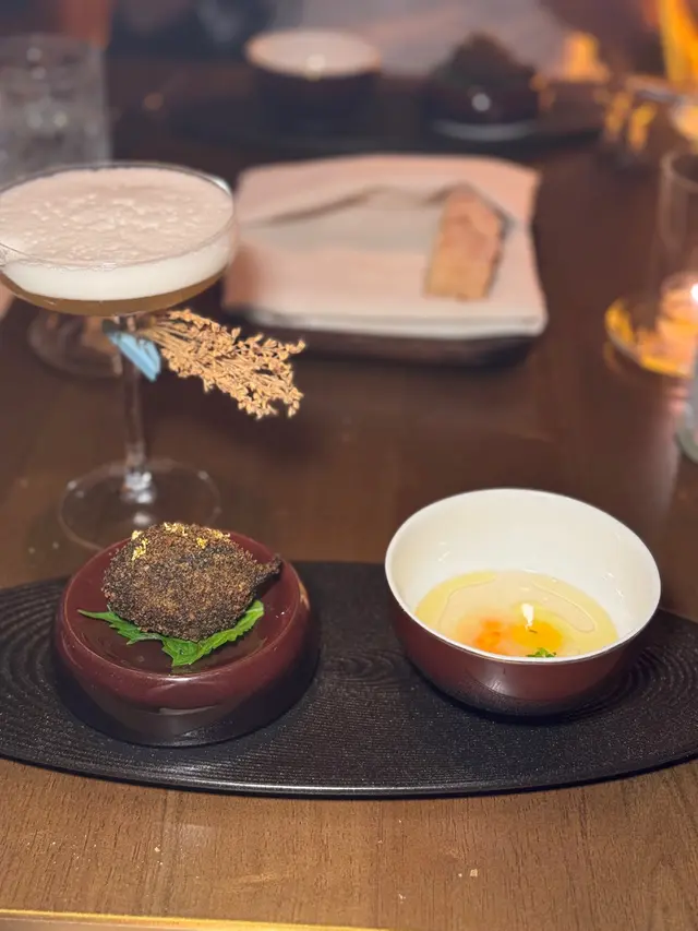 首先食中間既紅蝦他他,蝦肉爽彈,配合埋蘿蔔洋蔥蓉;右邊係52度慢煮既日本帶子撻,帶子肉嫩多汁;左邊黑色既原來係海膽撻用咗墨魚啫喱整成容器咁,海膽既鮮甜係口入面爆發
