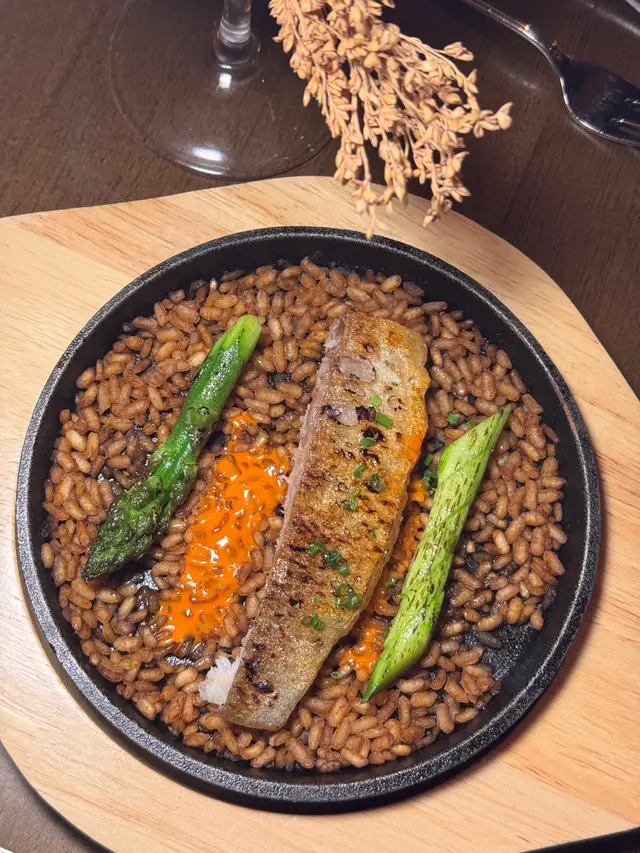 西班牙海鮮飯上面係脆煎馬友魚柳,飯盡吸海鮮精華味道,魚柳外脆內嫩,魚肉順口無刺