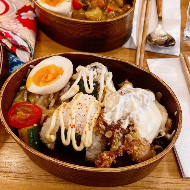 便當用好靚嘅日式布料包住,賣相相當精緻,入面有兩件大飯團,一件咬開中間有吞拿魚,令一件係醬油味飯團,配上四件炸雞,份量都幾多。雞腿肉都幾嫩滑,配埋他他醬同旁邊嘅配菜食都唔錯。