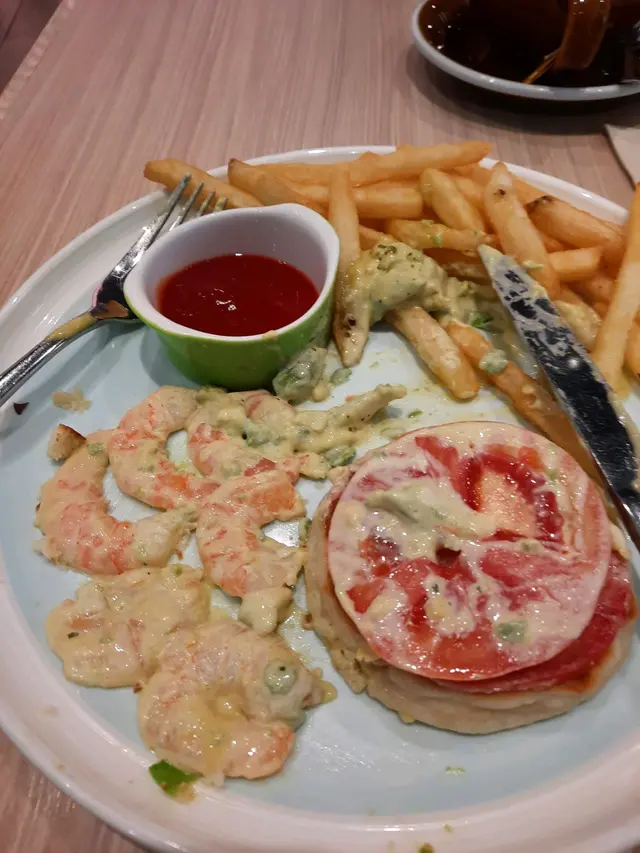 至如食物,味道不錯,但百多元的蝦漢堡,只有3隻開成6片的蝦,兩片生菜、和兩片蕃茄和少許牛油果。加上無誠意的兩片檸檬的檸檬茶,也沒問你要不要糖,那待薄指數真的太高了。