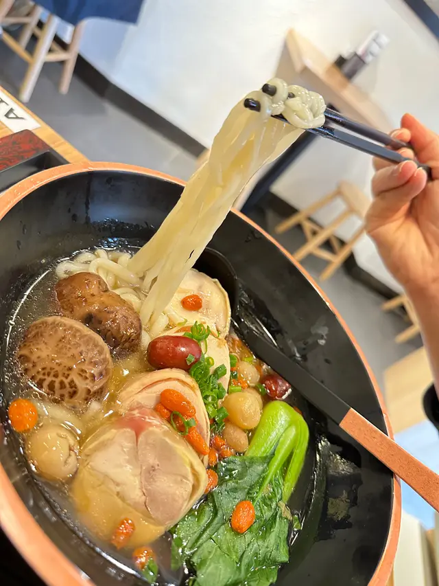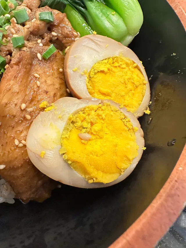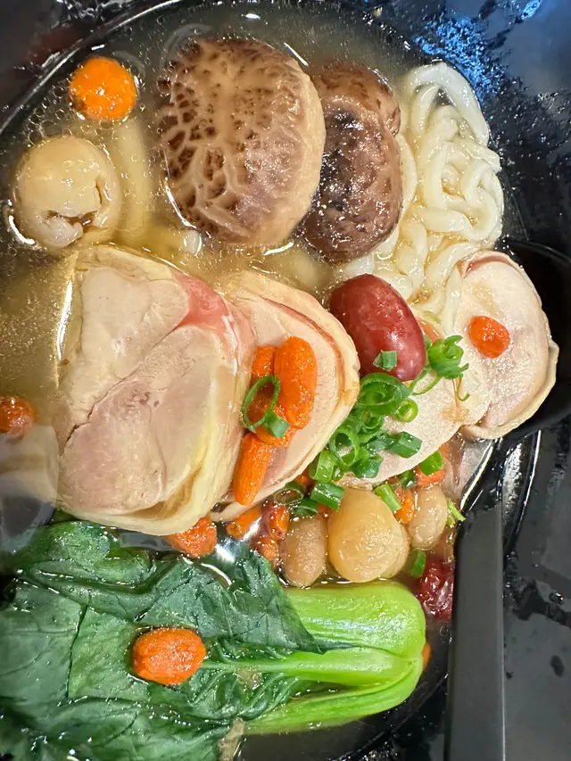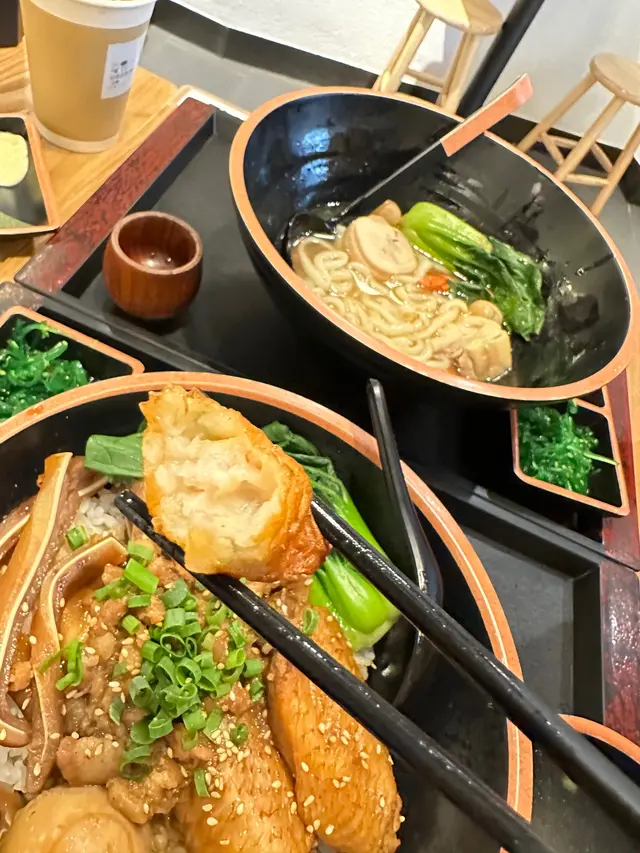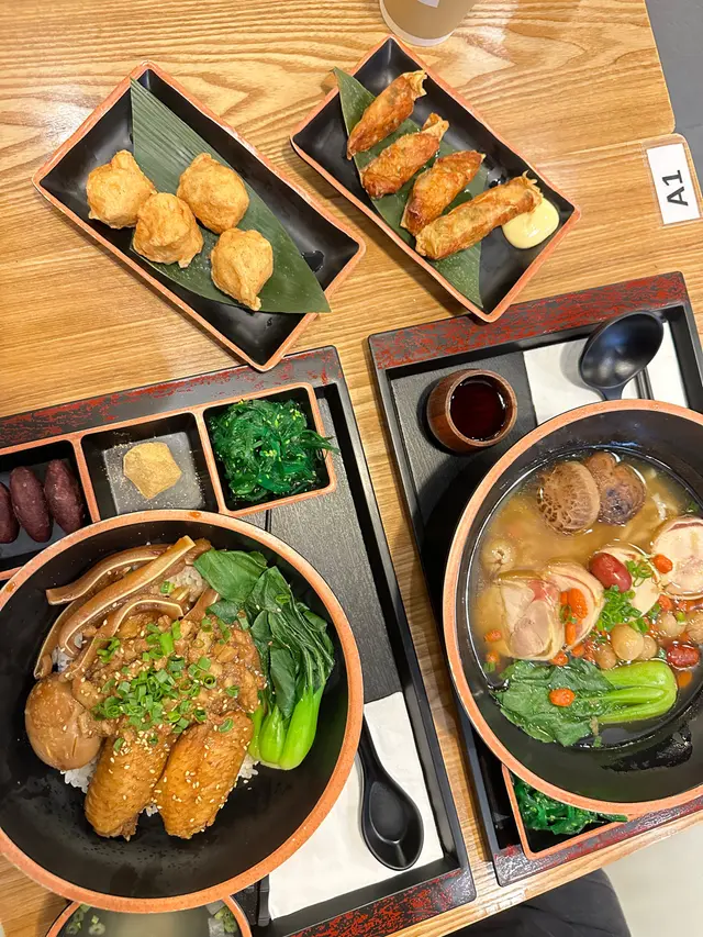 花雕麻油雞湯麵,個酒係可以自己鍾意落幾多就幾多份量。聞落好濃香入秋涼涼地進補都好岩食雞都幾厚身🤤菇身亦好厚好大隻、而麵身又唔會太淋有口質。四寶飯主要係滷水嘢,有蛋、雞翼、豬耳魯肉都好入味連蛋整開一齊食好好送飯。佢哋嘅份量都大、順帶一提佢餐仲跟左前菜中華沙律、迷你甜薯同蕨餅👍 照顧哂前,主,甜,夠飽飽~