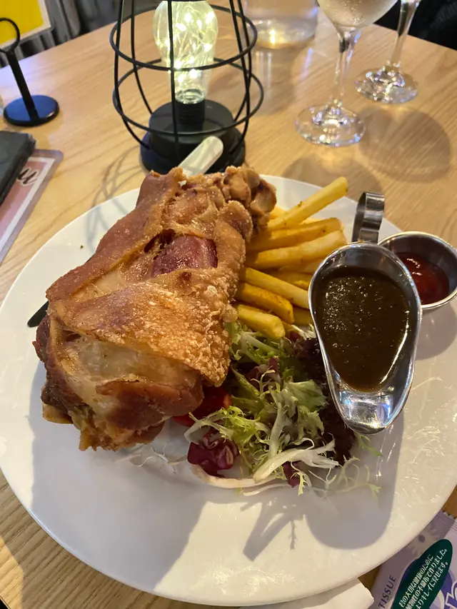 香口邪惡的鹹豬手,豬手炸到脆卜卜,而仲有薯條做配菜,的確好邪惡🤣大大舊,兩個人份量來說,絕對夠飽😙切完豬手配合埋黑淑汁,更加惹味😊