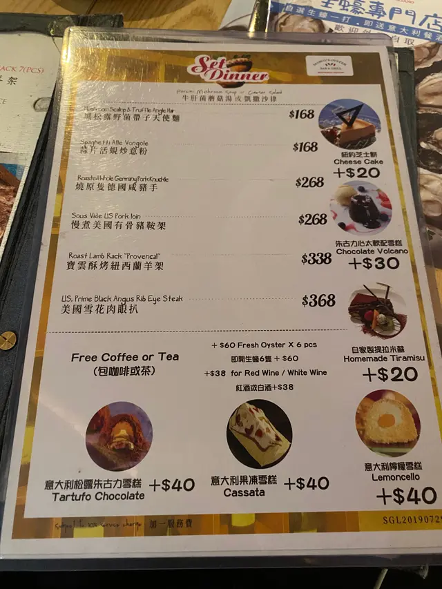 餐廳都有好多唔同選擇,不過人少少就order 兩套set dinner 。set dinner 有前菜/湯、主菜、餐飲,經濟實惠! 另外可加$60 換購半打生蠔,而我地仲加配左兩杯白酒chill 下🥂