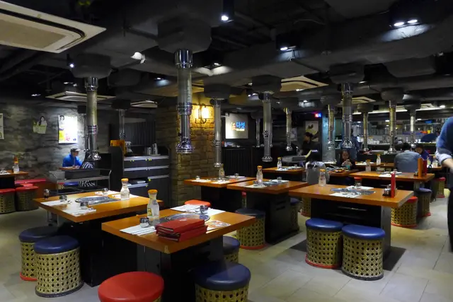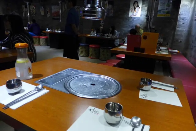 地庫空間感十足,牆身以灰色為主調,配上木製的餐桌,使紅藍相隔的椅子更顯得省目耀眼。而椅子也跟大部份韓烤店一樣,掀開頂部,就可把衣袋放在入面,以免在燒烤時吸去油煙味。而每張桌上也置有一具抽風機。