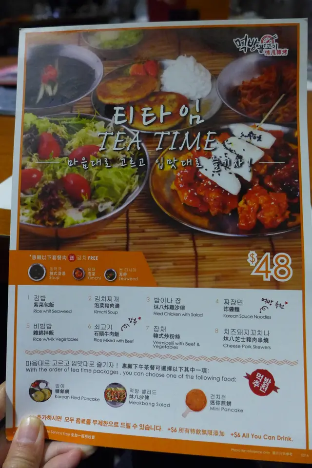 下午茶餐共有八款選擇,$48就可選一款主食和一款小食,另外還附送韓式清湯和菜菜