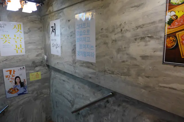 沿薯樓梯而下就能到達地庫,樓梯兩邊的牆上貼上寫滿韓文的poster。