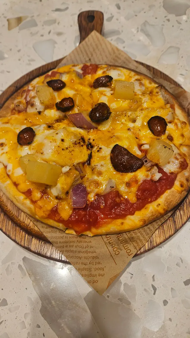 餅皮酥脆內裡柔軟,滿滿的濃郁芝士拉絲好誘人,加了奧爾良烤雞肉片、菠蘿、洋蔥和番茄醬,口味層次很豐富!