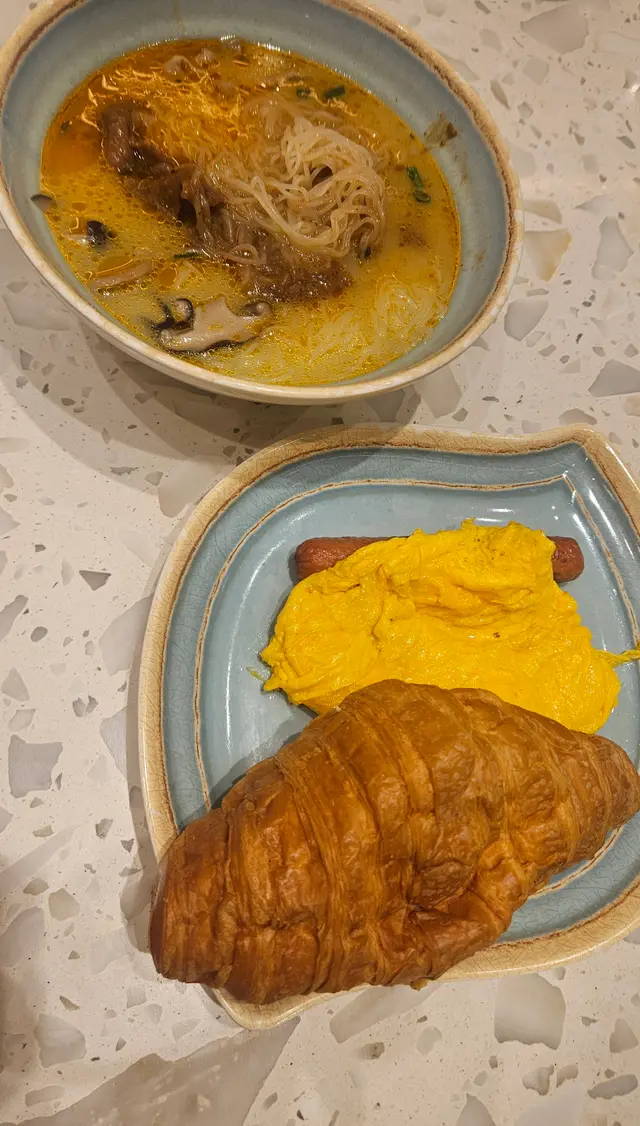 沙嗲湯底香濃微辣,牛肉片嫩滑爽口,米粉吸飽了湯汁精華,順滑惹味!配上大大個牛角酥包,腸仔,炒蛋,五六十蚊就可以吃的好飽了!