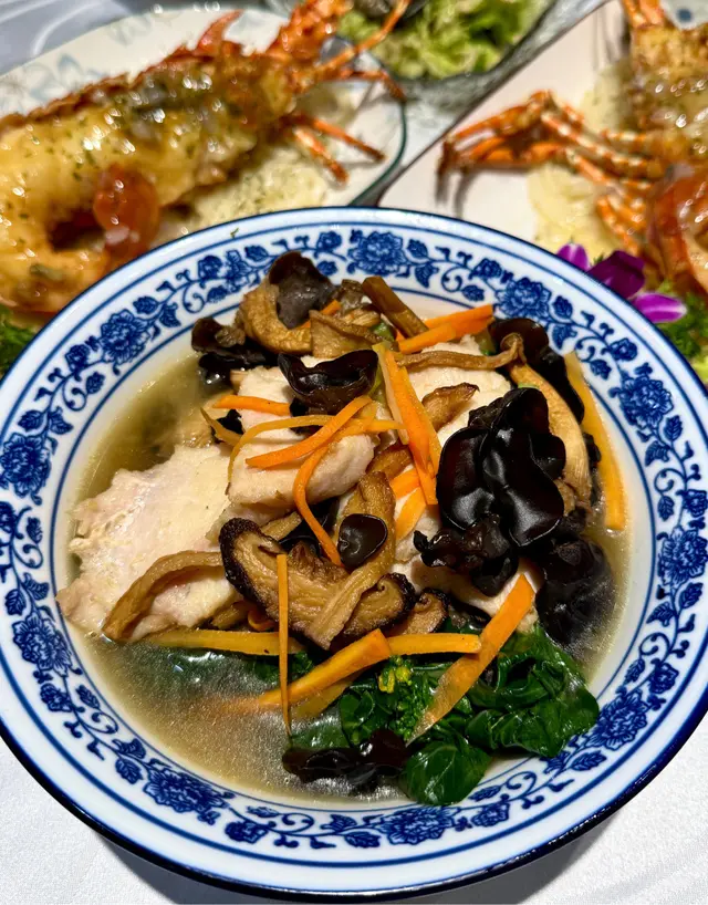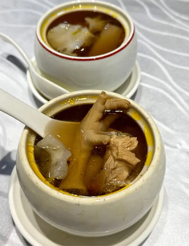 原盅材料豐富,多到滿瀉,有螺片、花膠、雞腳、雞胸、瘦肉、杞子,仲有少少魚翅,面層有金黃色雞油,燉湯味道香濃,入口膠質滋補而清澈唔膩