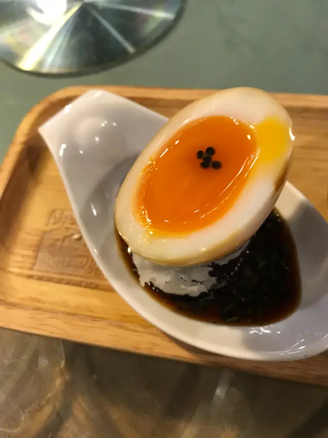 拼盤之一充滿茶燻香味的流心蛋伴黑魚子醬配厚切茄子