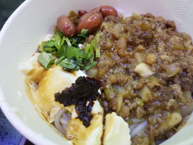 先把豆花,肉醬,米線伴勻,微辣口感辣得過癮。