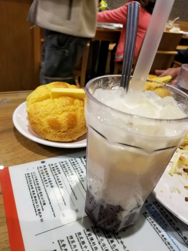 不出十分鐘,我們能幸運地入到座。我們一行四人,一人叫一個菠蘿油,三杯紅豆冰,一杯咸檸七,一個芙蓉蛋飯,一個黯然消魂飯。