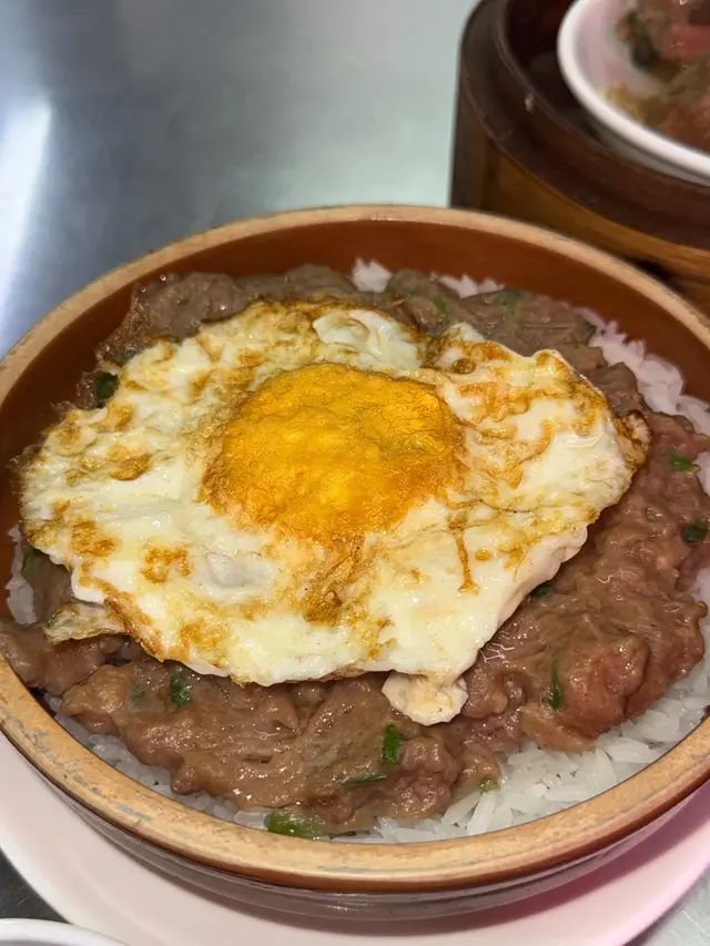 滑溜美式牛肉粒炒得香口,薑蔥蒜三重奏,牛味濃到爆!鋪滿白飯後打上金黃太陽蛋,一戳蛋黃瀑布瞬間淹沒牛肉飯,鹹香+蛋香+飯香三合一,一碗36蚊直接吃到舔碗!