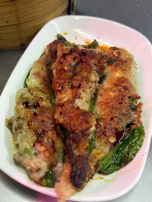 虎皮椒煎到表面焦香起虎紋,釀滿鮮蝦膠+馬蹄,一咬椒香+蝦彈+微辣三重奏,外焦內嫩,完美ending!