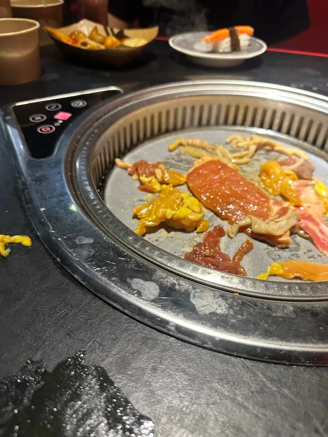 咁入到去,入邊嘅餐廳環境昏暗好有格調😂,衛生情況就一定唔理想㗎啦😂所有嘢都係油冧冧。而佢嘅自助食物種類都幾豐富,大家可以燒食物同埋攞壽司,再加上用咗出前一丁粉嘅豬骨湯打邊爐👍🏿