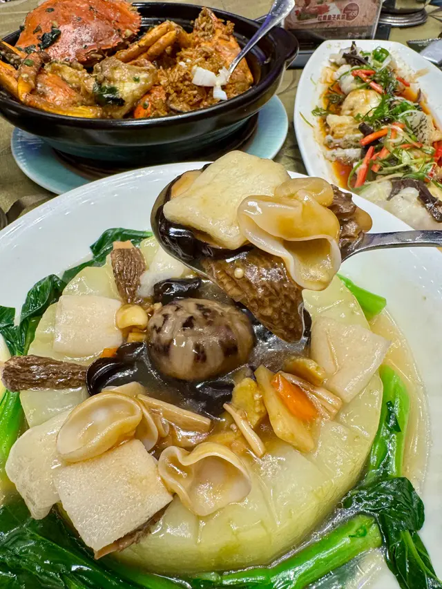 🥢羊肚菌竹笙玉盤艷素都好正,超大個冬瓜做基底,煮到好軟熟好入味。羊肚菌煮得綿綿地,竹笙脆帶汁,配埋其他蔬菜如菠菜苗同豆腐,味道清甜,