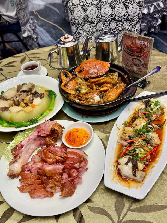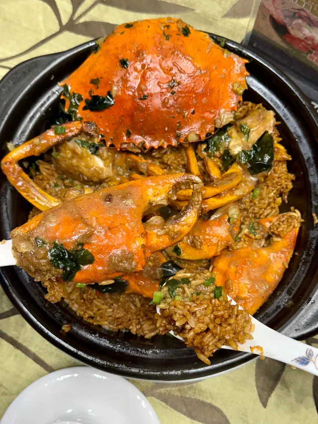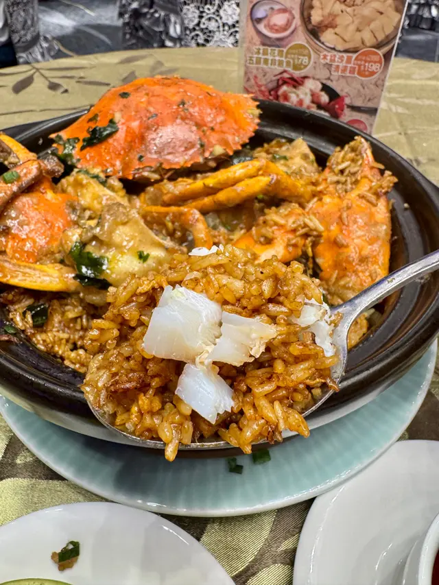 👍🏻食物方面,專登點咗招牌白胡椒蟹飯,隻蟹勁大隻,蟹肉嫩滑多汁,白胡椒味滲入蟹殼,入口微辣帶鮮甜,唔會太重口,蟹鉗仲要厚實,咬落脆脆地有蟹香,感覺係蟹控嘅天堂。配埋炆飯底,飯粒軟糯吸晒蟹汁,味道好夾,份量一鍋夠兩三個人食