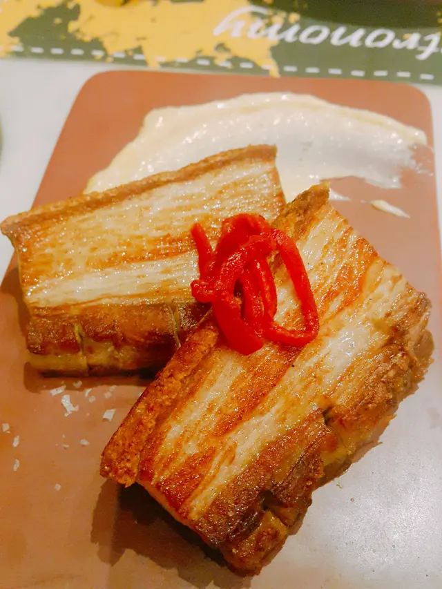 脆皮豬腩肉, 外皮真係夠晒脆, 索索聲, 唔會太燶, 外脆內嫩. 肉質跟脂肪平均, 所以入口夠嫩. 味道唔會太咸, 配上蛋黃醬更加提升.