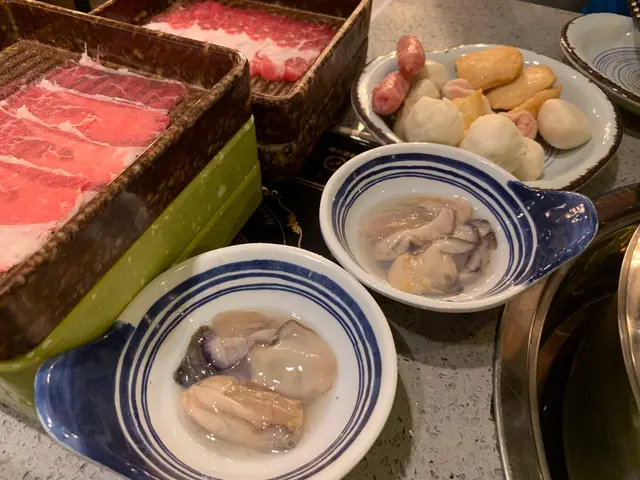 而火鍋配料一啲都簡單,除左普通嘅丸類,菜類,粉麵類,竟然仲有「海鮮」呀!唔需要另外加錢就可以食海鮮喇,而且海鮮嘅種類都好多,有蝦,蜆,魚,最驚喜嘅係「生蠔」!!係生蠔呀!當然要整熟先食啦!職員唔知係咪見我地主攻海鮮,仲送多兩隻鮑魚比我地試下添!