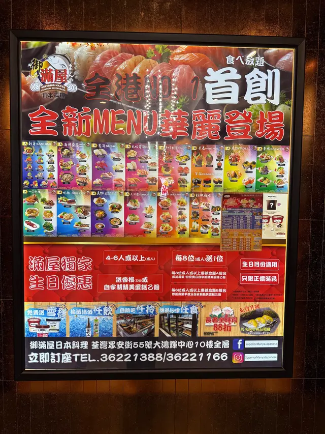 有齊阿根廷赤蝦、挪威三文魚、油甘魚、劍魚腩、象拔蚌、赤貝、北海道帶子及松葉蟹腳等十多款選擇,件件厚切鮮甜