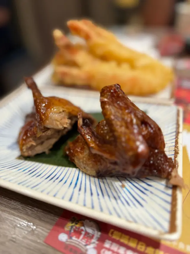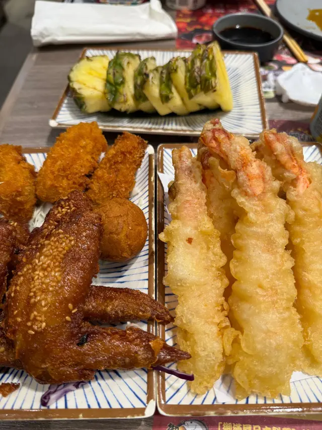 虎蝦、南瓜及蕃薯天婦羅炸漿薄而脆入口唔覺油膩另外芝麻雞翼、吉列炸蠔及紫心香芋丸都是即叫即炸入口香脆