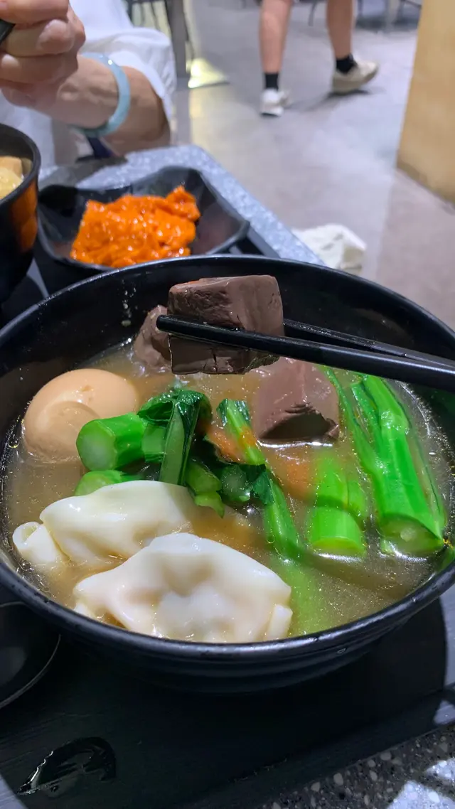 ▶ **配料**:醬油流心蛋黃澄透心、豬紅滑嫩無渣、韭菜餃菜鮮皮薄;
