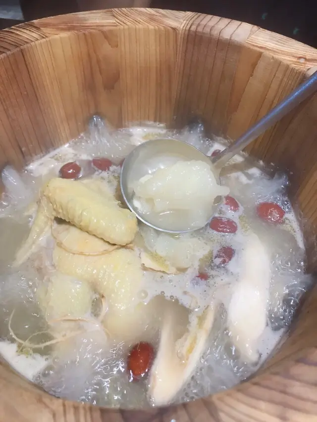 藥膳火鍋套餐有5款湯底揀,我地要左花膠螺頭藥膳雞鍋~ 個湯底好足料,好多件花膠,仲見到有杞子、人蔘等等既藥材。雞有半隻,等佢煲熟左店員會幫手拎入廚房斬開比我地食😌 個雞煲完都仲幾滑,仲吸晒個藥膳湯底既味,好香!