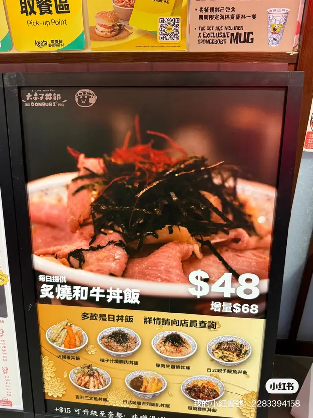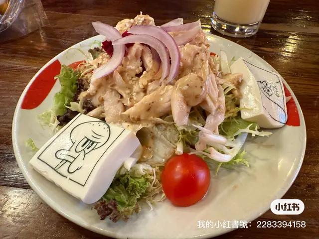 很特別的豆腐,印有海綿寶寶卡通內的太大聲和章魚哥造型,外型非常可愛,有沙律菜和雞肉的配合,十分開胃。