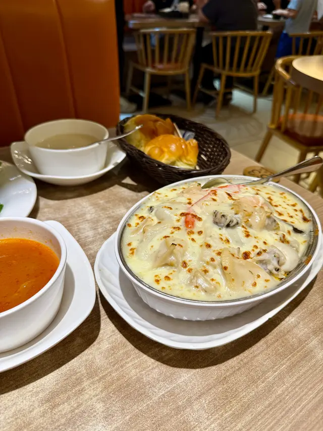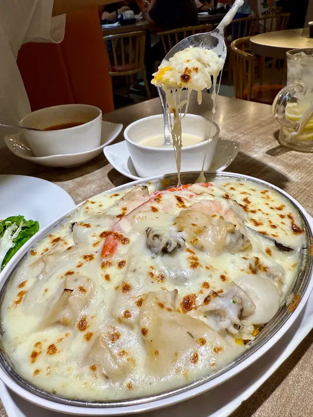 另一道主菜係焗白汁海鮮飯,夠焗得香脆,面層有薄薄一層芝士,唔會太漏,入面海鮮份量唔吝嗇,有蝦有青口有魷魚,白汁唔膩,係啱啱好咁Creamy,撈飯一流。