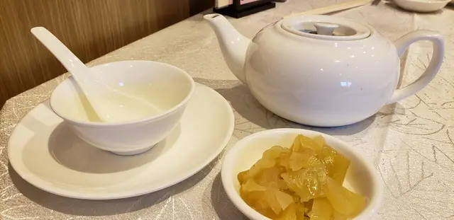 我們點選了壽尾茶,每位茶錢$15亦不算貴,茶味清香而沒有苦澀味,餐具以白色為主,前菜是一碟咸菜($15),味道甜甜酸酸,很開胃。