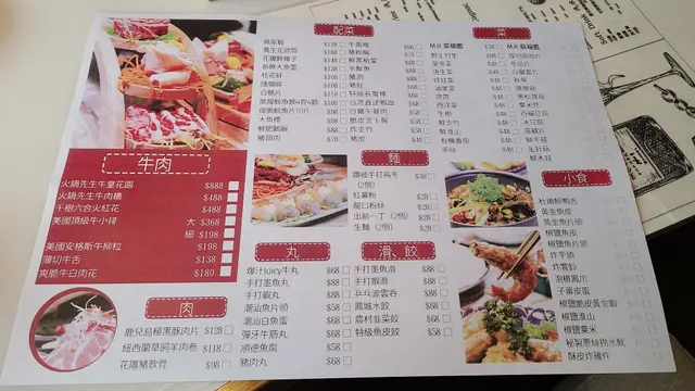 餐牌:湯底,肉,配菜,麵,丸,滑,餃,菜,小食,刺身,活魚刺身,海鮮