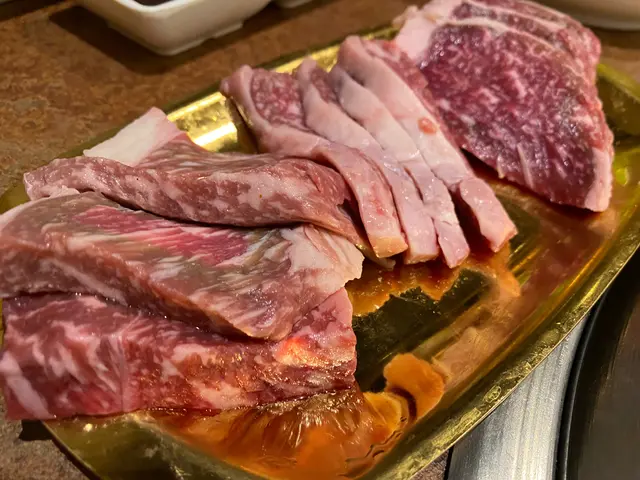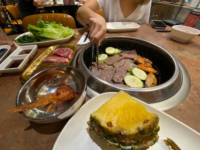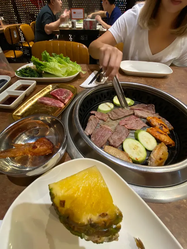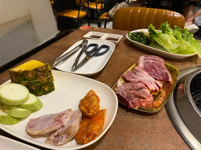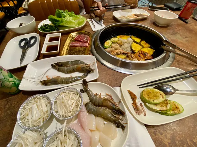 餐牌上,有好多任點項目,例如頂級雪花牛小排,美國安格斯肉眼扒,頂級翼板牛扒,韓式美國安格斯一ロ牛粒,美國大理石,韓式美國短骨牛排,金菇牛肉捲,五花腩片 ,海蝦,帶子,魚塊等等………有海鮮,有牛類,有豬,有雞類 ,滿足到我不同食「肉」感,哈哈。(小補充,出面有燒汁,辣醬可以自由添加到食物中)