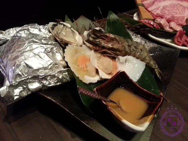 【海鮮拼盤 - Assorted Seafood】有虎蝦、魷魚、帶子、鮮蠔及鱈魚,服務員特別提醒我們燒帶子和鮮蠔時要加些特製醬汁。蠔軟滑鮮甜,魷魚稍薄,而帶子和虎蝦則不太新鮮,肉質較霉。