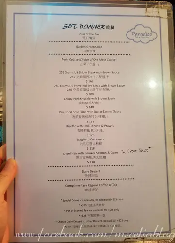 Set 晚餐除咗主菜有多款選擇之外, 仲跟餐湯, 田園沙律, 是日甜品同咖啡或茶.