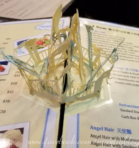 服務員帶了我地坐低跟手遞上餐牌, 因為見隔離枱未有人, 偷偷地拎埋隔離餐牌睇, 原來有分別㗎, 佢嗰個打開中間位有個立體旋轉木馬, 好有心思呀.