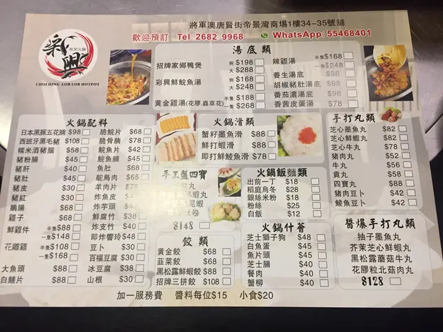 我留意到餐廳的湯底很有特色,有招牌家鄉鴨煲、彩興鮮鯇魚湯、黃金雞湯、辣雞湯、養生湯底、胡椒豬肚湯底、番茄濃湯底和香茜皮蛋湯。看見旁邊的客人點了番茄湯底,有幾塊大骨頭、幾粒番茄和薯仔,想必其他湯底也不錯。