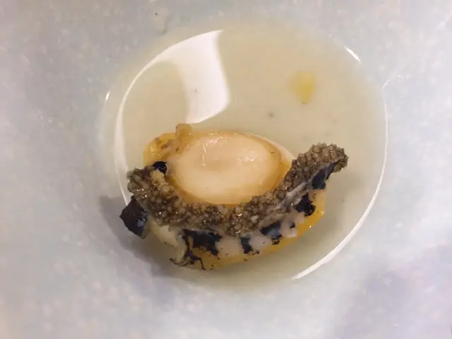 燙過的鮑魚會縮水,每隻大小不一。吃一口現煮的迷你鮑魚,鮑魚軟韌爽口,嚼起來不費勁,鮮甜的肉汁在口腔爆發,鮮味一絕,沒有蘸醬油也沒關係。