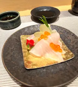 賣相很美.   薄切鰈魚伴上  金黃色 三文魚籽,  迷你 紅玫瑰,  綠色 蓮芋莖  + 日本葱苗.   超級悅目.
